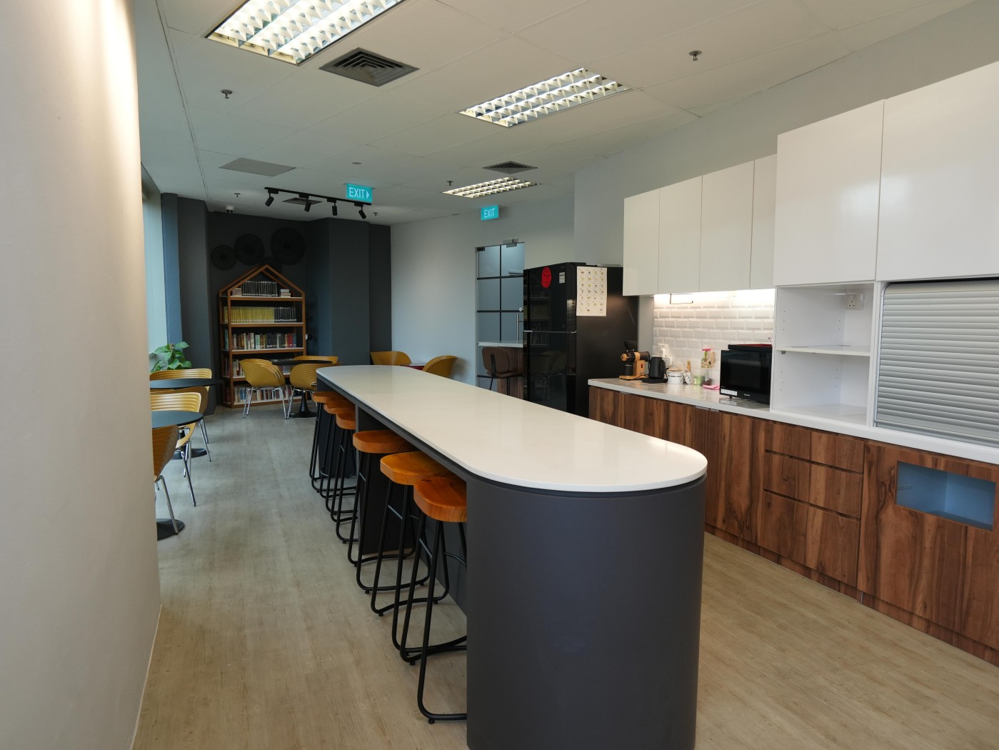 The campus features air-conditioned classrooms equipped with smart TVs and whiteboards to support interactive learning. Students can also enjoy a spacious pantry complete with a refrigerator, microwave and seating area, perfect for breaks and casual conversations.